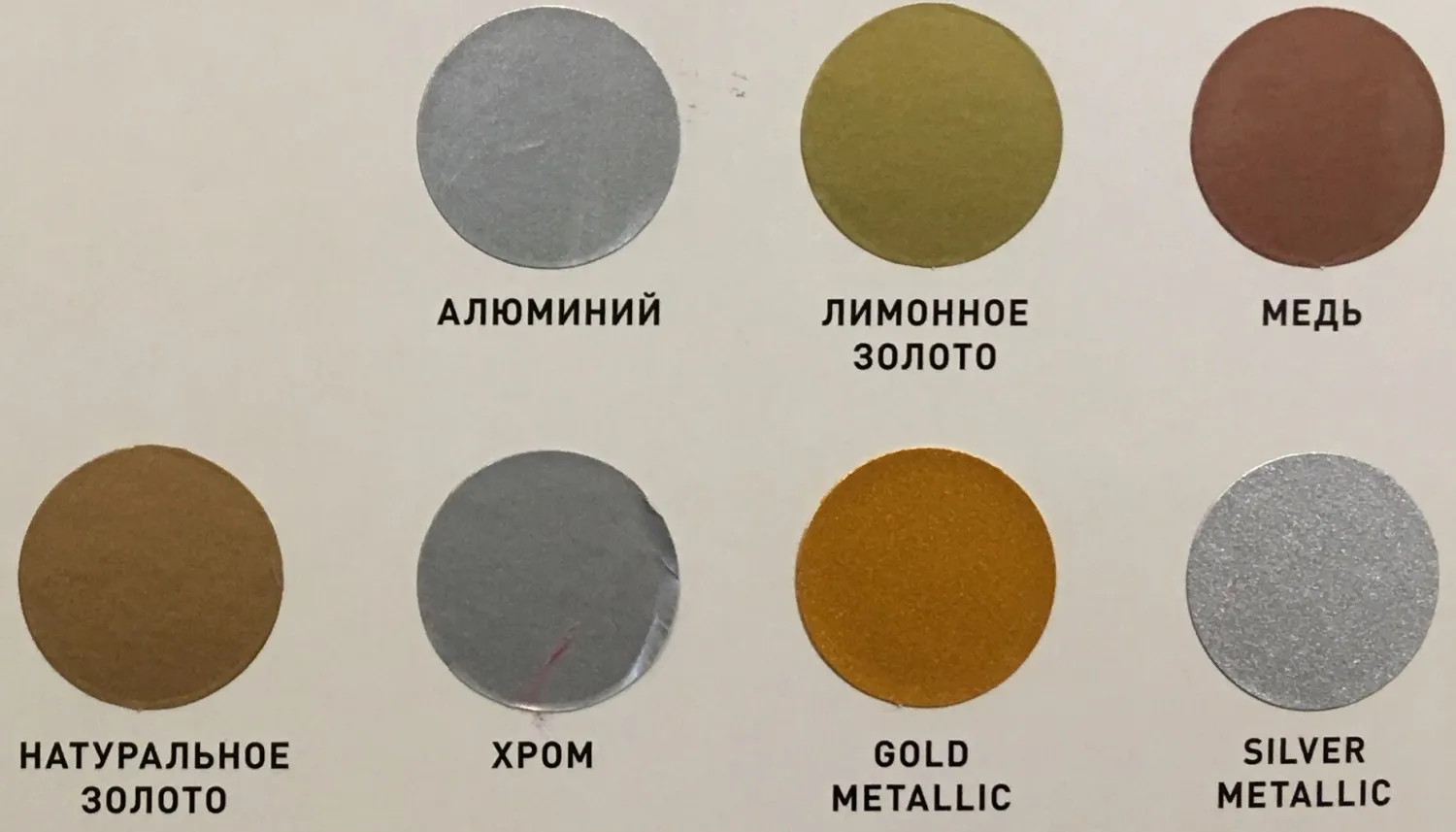 Цвета: Gold metallic, аллюминий, медь, натуральное золото, хром, бронза, латунь, старая медь.